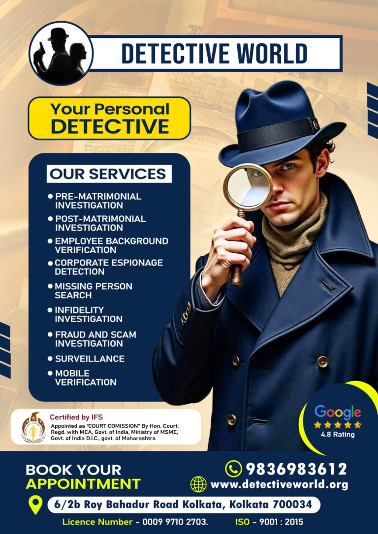 Based in Kolkata, we specialize in missing person searches, fraud detection, and infidelity investigations with the utmost dedication. With a strong reputation and Google 4.8-star rating, we promise integrity, discretion, and results you can trust. When you need answers—Detective World finds them for you.