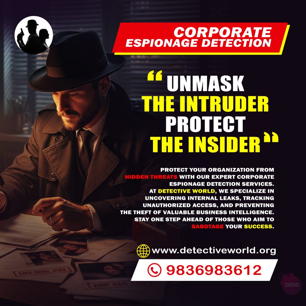In the modern corporate battlefield, danger doesn’t always arrive wearing a mask—sometimes it enters through your own doors. Internal espionage has become one of the most silent yet devastating threats to business security. At Detective World, we specialize in revealing what others fail to notice. Our team dives deep into digital footprints, behavioural patterns, and covert communication trails to detect secret data leaks and hidden sabotage attempts. Using cutting-edge surveillance intelligence and forensic technology, we expose the truth before it harms your organization. Protect your ideas, secure your strategies, and stay steps ahead of anyone who tries to infiltrate your trust. With Detective World, your business stays protected—inside and out.